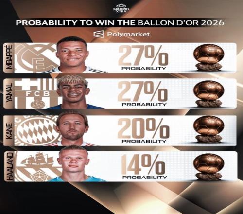 02月04报道 相关机构近期更新了2026年金球奖的获奖概率预测,目前姆巴佩与亚马尔并列领跑,两人获奖概率均为27%,凯恩和哈兰德则紧随其后。