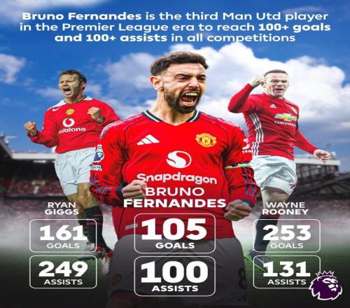 据统计,布鲁诺-费尔南德斯成为英超时代第三位各项赛事进球和助攻数均达到100的曼联球员,前两位分别是吉格斯(161球249助)和鲁尼(253球131助)。